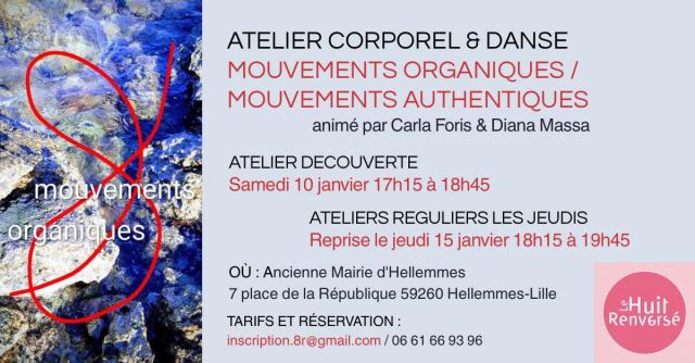 8Jan2026 Reprise des ateliers Mouvements organiques/ Mouvements authentiques Posté dans Le Huit Renversé par 8renverse Atelier découverte samedi 10 janvier de 17h15 à 18h45Ateliers réguliers les jeudis de 18h15 à 19h45. Partagez ! Partager sur X(ouvre dans une nouvelle fenêtre) X Partager sur Facebook(ouvre dans une nouvelle fenêtre) Facebook J’aime chargement… Articles similaires