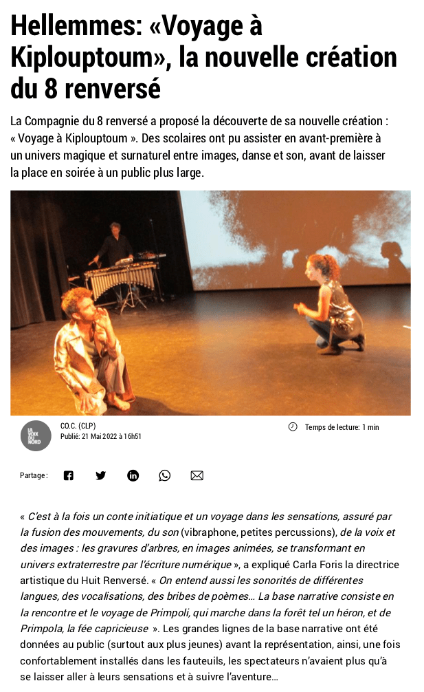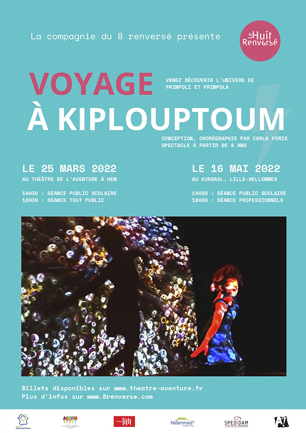 Le spectacle en quelques mots : Dirigé par la chorégraphe Carla Foris, « Voyage à Kiplouptoum » invite le spectateur à suivre le voyage initiatique de Primpoli qui part à la recherche de Primpola. Les 2 protagonistes, rêvent l’un de l’autre, sans se connaître. Le chemin est sinueux, mais Primpoli est guidé par les panneaux d’itinéraire et par l’intuition d’être soutenu… C’est en somme un duo voguant entre danse et théâtre, entre réel et irréel et un spectacle alliant musique, images et  écriture numérique/vidéo
